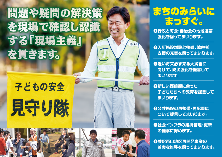 私は蕨生まれ・蕨育ちの蕨市民として県政に対して問題意識を持ち、疑問や矛盾を感じるものについては必ず現場を訪れる現場主義をこれまで同様に貫き、汗と泥にまみれます!br> 「今だけ」「自分だけ」という損得勘定では動きません!